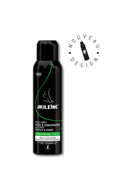 AKILEÏNE® Spray 3 en 1 para pies y calzado regula la transpiración excesiva, desodoriza e higieniza el interior del calzado.